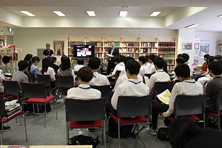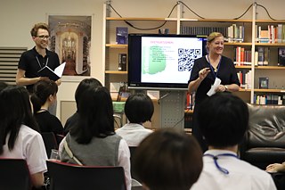 Die 55 Teilnehmer/-innen fanden sich zu Beginn der Veranstaltung in der Bibliothek im zweiten Stock ein und wurden vom PASCH-Koordinator Christian Steger und Mitarbeitern der Bibliothek und Sprachabteilung begrüßt. Im Anschluss stellten sich der Leiter der Sprachabteilung Herr Matthias von Gehlen und die Leiterin für Informatik und Bibliothek Frau Michaela Bodesheim den jungen Besucher/-innen kurz vor und gaben erste Einblicke in die Arbeitsbereiche des Goethe-Instituts in Japan, aber auch weltweit. Darauf folgte die Teambildung, bei der Schüler/-innen gleicher Oberschulen durch ein Bilderpuzzle in Dreiergespanne aufgeteilt wurden und mit jeweils einem iPad ausgestattet ihre „Schatzsuche“ durch das Institut begannen.