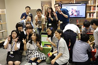 Die Rallye war so aufgebaut, dass sich die Teams, ähnlich wie bei einer Schnitzeljagd,  durch den zweiten und dritten Stock des Gebäudes navigieren und mithilfe von Plakaten, Büchern oder auch  Programmflyern so viele Fragen wie möglich beantworten, um Punkte für ihre jeweilige Schule zu sammeln. Fragen wie z.B. „Wo wurde Wolfgang von Goethe geboren?“ oder „Welche PASCH-Veranstaltung findet vom 13. bis 14.07.2019 am Goethe-Institut Tokyo mit der Theaterpädagogin Anne Zühlke aus Berlin statt?“ waren dabei Programm. Manchmal waren auch kreative Lösungen von den Teilnehmenden gefordert. So konnten sie sich mit einem kurzen Video, in welchem sie ein kniffliges deutsches Wort wie „Quietscheentchen“, „Bürkoklammer“ oder „Schwarzwälder Kirschtorte“ versuchten auszusprechen, einbringen. Auch die Suche nach einem spannenden Buchcover, das die Gruppenmitglieder repräsentieren sollte, führte nicht nur zu einem regen Austausch unter den Lernenden, sondern auch zu viel Gelächter und guter Stimmung.