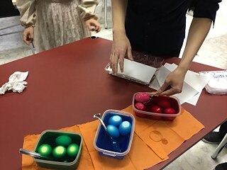 Frau Milena Belaschky, die neue Praktikantin der Sprachabteilung, begann den Workshop mit einer aufwendig und liebevoll gestalteten Präsentation, um den Schüler*innen den Frühling in Deutschland und die damit verbundenen Traditionen näherzubringen. Neben typischen Frühlingsbräuchen und Festen, unter anderem natürlich dem Osterfest, stellte sie vor allem Feierlichkeiten aus Norddeutschland und ihrer Heimat Hamburg vor. In Kleingruppen lösten die Schüler*innen kniffelige Quizfragen, diskutierten angeregt untereinander, erweiterten ihren Wortschatz hinsichtlich einiger typisch frühlingshafter Begriffe (Aprilscherz, Frühlingsputz usw.) und wurden bei der sich anschließenden Ostereier-Werkstatt sehr kreativ. Die Eier erstrahlten in vielen bunten Farben und einige wurden sogar mit typisch japanischen Anime-Charakteren wie Doraemon oder Totoro bemalt. Mit verschiedenen Techniken wie Stickern oder Gummibändern, konnten hübsche Muster auf die Eier gezaubert werden. Die Herstellung von Ostereiern war für alle Schüler*innen eine lustige Erfahrung, weil es für sie auch das erste Mal war.