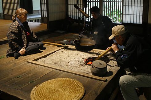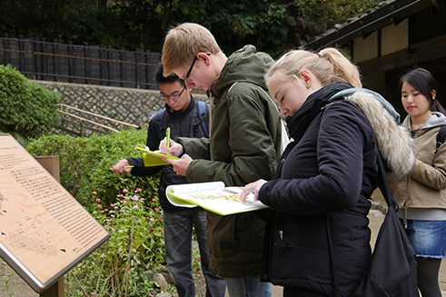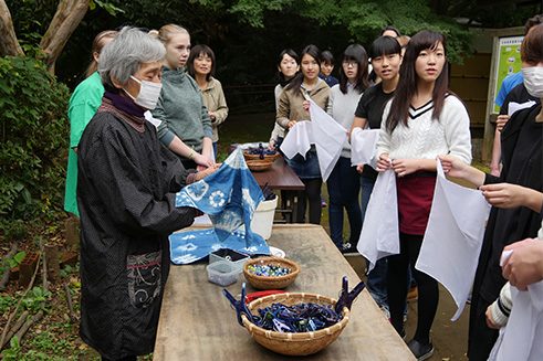 Zu Beginn des Besuchs im Minka-en lernten die Schüler in einem Workshop die traditionelle Technik des Indigo-Färbens, aizome, kennen. Mit Klammern und Schnüren bearbeiteten sie zunächst weiße Tücher und tunkten diese dann in große, im Boden versenkte Farbkrüge. An der freien Luft erhielten die Stücke durch die Oxidation der Farblösung ihre eigentümliche blaue Farbe und die Klammern und Schnüre sorgten für individuelle Muster. Nach einer Pause und Stärkung mit Buchweizennudeln in einem eindrucksvollen alten Haus im Gasshô-Stil ging es in Kleingruppen auf Entdeckungstour. Ein Quiz half dabei, die wichtigsten Informationen über die Gebäude zu sammeln. Daraus erarbeiteten die Schüler eine Präsentation über das Museumsdorf, die Sie sich hier ansehen können: