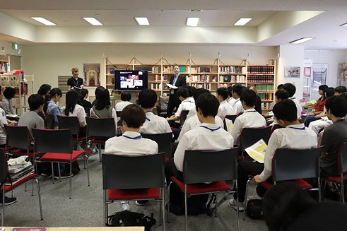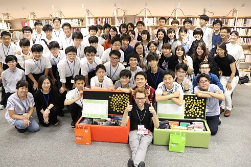 30分後、全チームが終わり、図書館に再び集合。そこで美味しいケーキを食べた。その後、簡単な図書館案内を聞いて、優勝チームが発表された。1位と2位の高校には、DVD, ドイツ語学習用ボードゲーム, ドイツの地理や文化についての本, コミック, AR(Augmented Reality)に使える資料, そしてVR/AR用ゴーグル等々いっぱい入った宝箱が賞品として授与された。それを獲得したのは北園高校と早稲田高校。宝箱はその2校に6ヶ月間貸出され、続いて獨協高校と木更津高専に引き渡される。その負けた2校には、ゲーテ・インスティトゥートの図書館で使える“VR-Experience“のクーポン券がプレゼントされた。