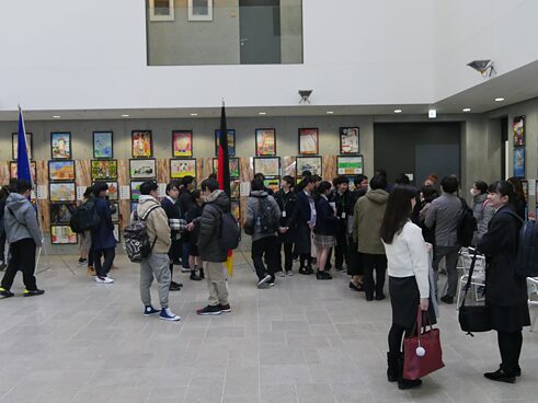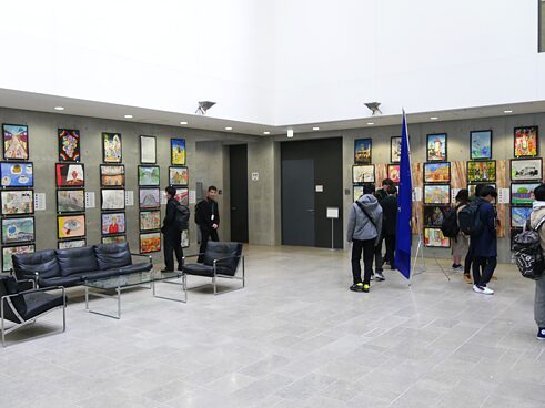 最後に敷地内のスポーツ施設を見学し、ホールの壁に飾られた日本人の小中学生の描いた作品をみた。生徒の作品は毎年行われている私のドイツ絵画コンテストのものだ。