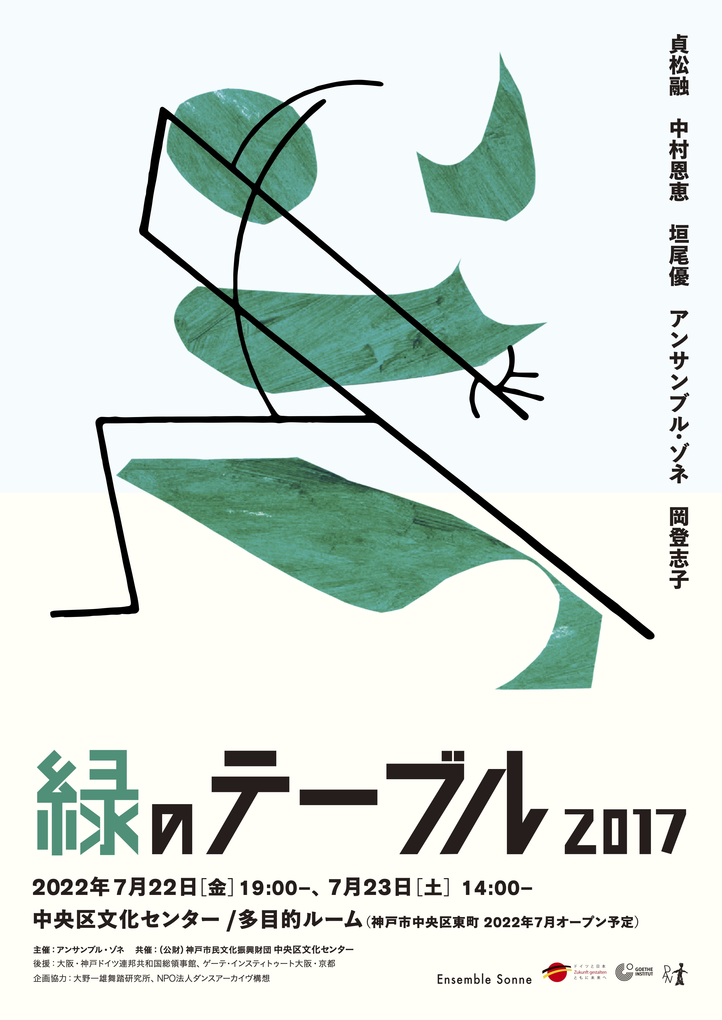 『緑のテーブル2017』は、ドイツ表現主義舞踊の振付家・教育者クルト·ヨース原作の「La Table Verte」(1932) に想を得て、アンサンブル・ゾネ振付家・岡登志子が原作の振付や音楽を一切使わずに新たに創作したダンス作品です。1932年、戦争の予兆が漂うこの時期に発表されたヨースの作品は、毅然とした反戦姿勢を示し「反戦バレエ」として、高い評価を受け、世界各地で数多く上演されてきました。