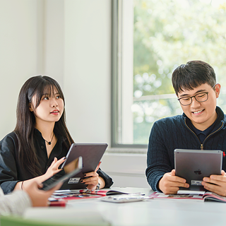 두 사람이 한 방에 앉아 iPad에 집중하며 독일어 수업에서 협업 또는 독립 과제를 수행합니다. © 노벰버 스튜디오 / 박정재 © 노벰버 스튜디오 / 박정재