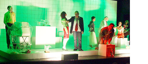 Die gesamte Phantasmagorie findet in einer schmerzhaft sterilen und weißen Umgebung statt. Das Bühnenbild, geschaffen vom Regisseur Oskaras Koršunovas selbst, zeigt die Toilette eines Cafés. Weiße Fliesen, Plastiktüten mit allen notwendigen Requisiten: Gläser, ein Kinderwagen, ein Riesenmesser... Der Regisseur beruft sich auf die immer steriler und fremder werdende Gesellschaft, wo sich unter der Maske der Normalität Perverse verbergen, die ihr eigenes Leben bereits ruiniert haben und nun darangehen, das Schicksal anderer zu zerstören.(Rima Čeliauskaitė „Das kalte Kind lässt das Publikum frieren“, Vakarų ekspresas, 08.03.2004)