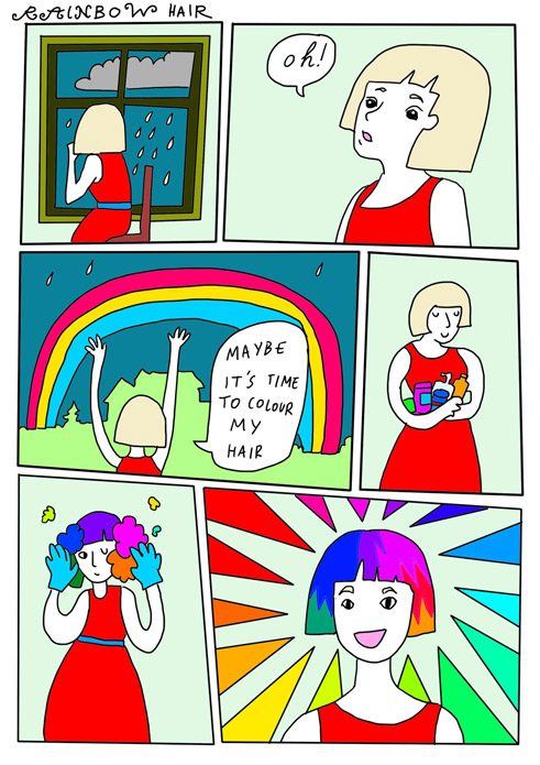 Farbenfroh und energiegeladen sind nicht nur die Werke von Sabīne Moore, sondern auch ihre Persönlichkeit. Ihre Geschichten sind verschieden: kurz und lang, von Hand gezeichnet und aus Papier geschnitten, oder graphisch am Computer erzeugt. Doch eines haben sie alle gemeinsam: Sie leuchten in allen Farben des Regenbogens. Thematisch sind ihre Geschichten eher ungewöhnlich und behandeln meist Abenteuer von Bananen und Erdbeeren im Dschungel – oder sie sind das genaue Gegenteil: sehr kurze autobiographische Episoden aus Sabines Leben, in denen sich allerdings auch die eine oder andere Frucht findet.