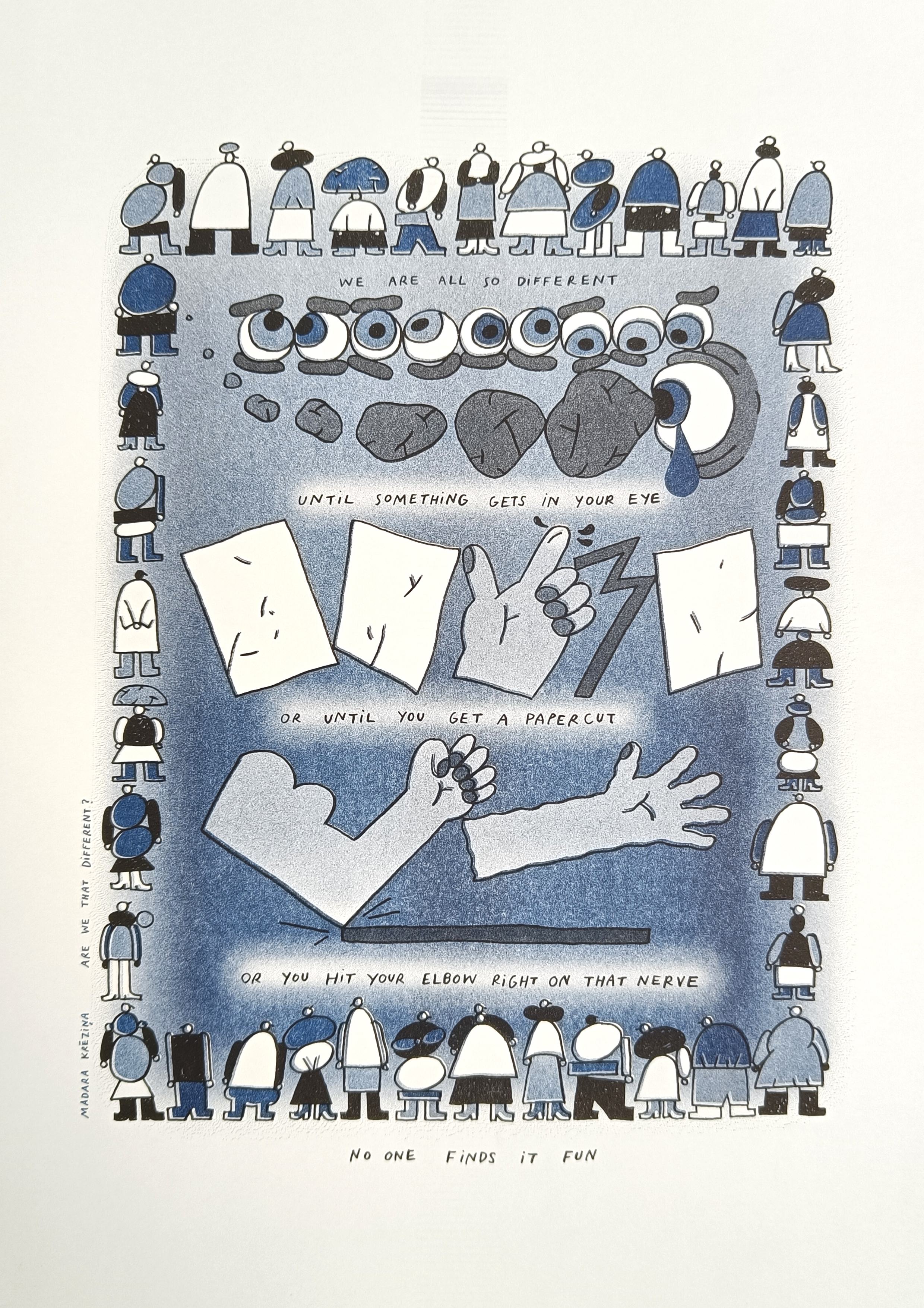 Ich bin Madara, Grafikstudentin an der Kunstakademie Lettlands. Ich liebe Druckgrafik, das Experimentieren mit verschiedenen Techniken und Materialien sowie das Zeichnen von zufälligen Formen und Charakteren in meinem Notizbuch.