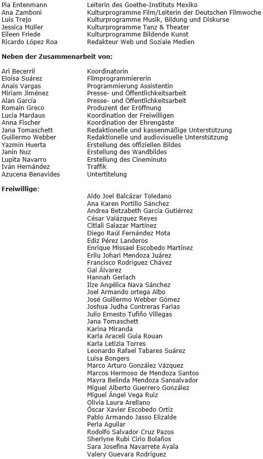 Die 22. Deutsche Filmwoche wird vom Goethe-Institut Mexiko und seinem Kulturprogrammteam organisiert: