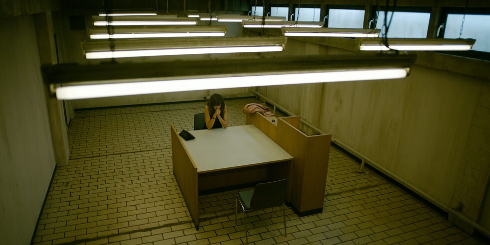 • "Parfum - Fesselung": Blick von oben in den Verhörraum der Polizei. Elena Seliger (Natalia Belitski) sitzt an einem Tisch. © ZDF/Jakub Bejnarowicz
