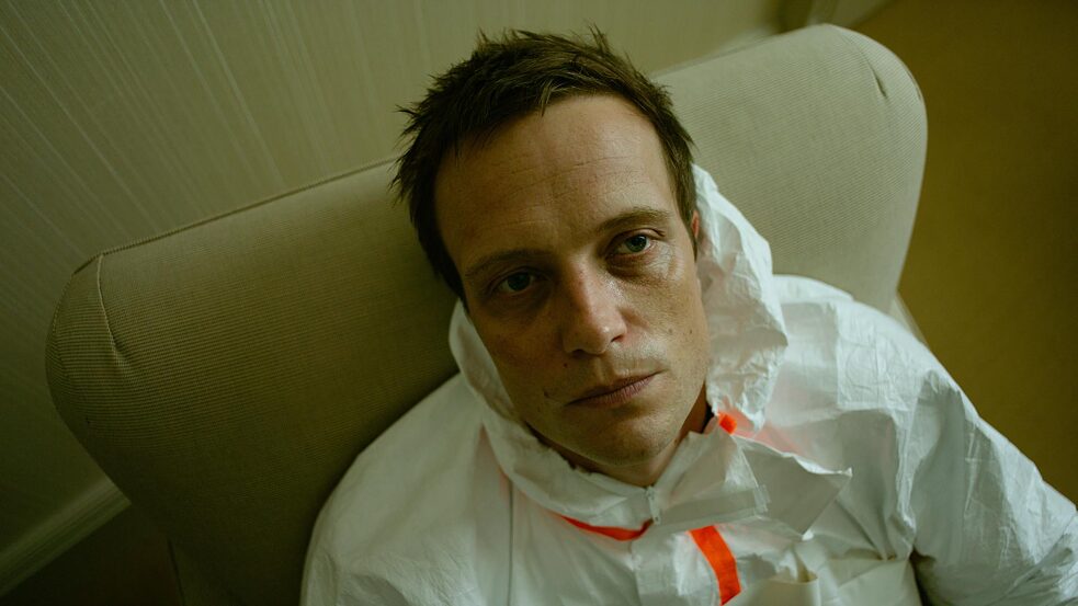 • "Parfum - Die dritte Substanz": Nahaufnahme von Moritz de Vries (August Diehl), der in einem weißen Schutzanzug auf einem Sessel sitzt und mit leerem Blick in die Kamera starrt. © ZDF/Jakub Bejnarowicz