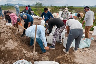 Wir erreichen den See Xalapango, wo uns bereits weitere Mitglieder der FPDT erwarten. Mittels einer von vielen gemeinschaftlich von den Einwohnern der Dörfer Atenco, Nexquipayac und Tepetlaoxtoc organisierten Aktionen werden sie versuchen, das Wasser des unteren Flussverlaufs zu stauen und damit den Äckern und Ökosystemen der Region neues Leben einzuhauchen. Wir füllen Sandsäcke und schichten sie auf. Der so entstehende Damm soll die Wassermassen zurückhalten und in eine andere Richtung ableiten, damit sie in der Umgebung bleiben.