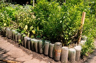 Der Garten Huerto Roma Verde wirkt wie eine blühende Oase inmitten der ihn umgebenden Wüste aus Autos, Lärm, Zement, schlechtgelaunten Menschen und Smog. Sobald man das – aus Dutzenden von blauen, zylinderförmig gestapelten Wasserkanistern gefertigte – Tor durchschreitet, ist mit einem Schlag alles anders: Bäume, Kieswege, bunte Wände aus natürlichen Materialien und eine durch und durch entspannte Atmosphäre.