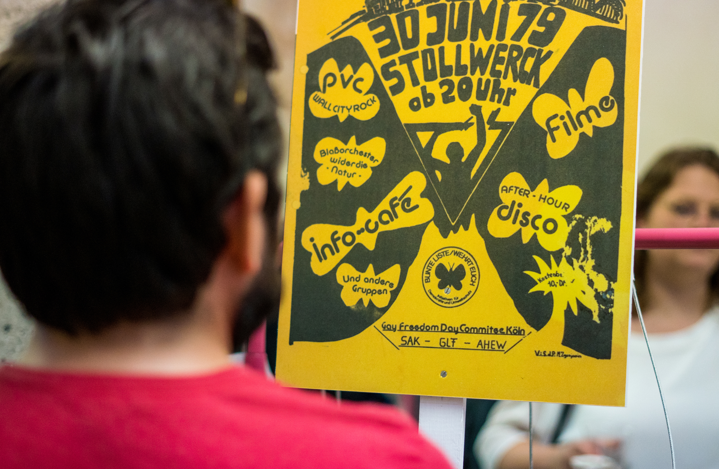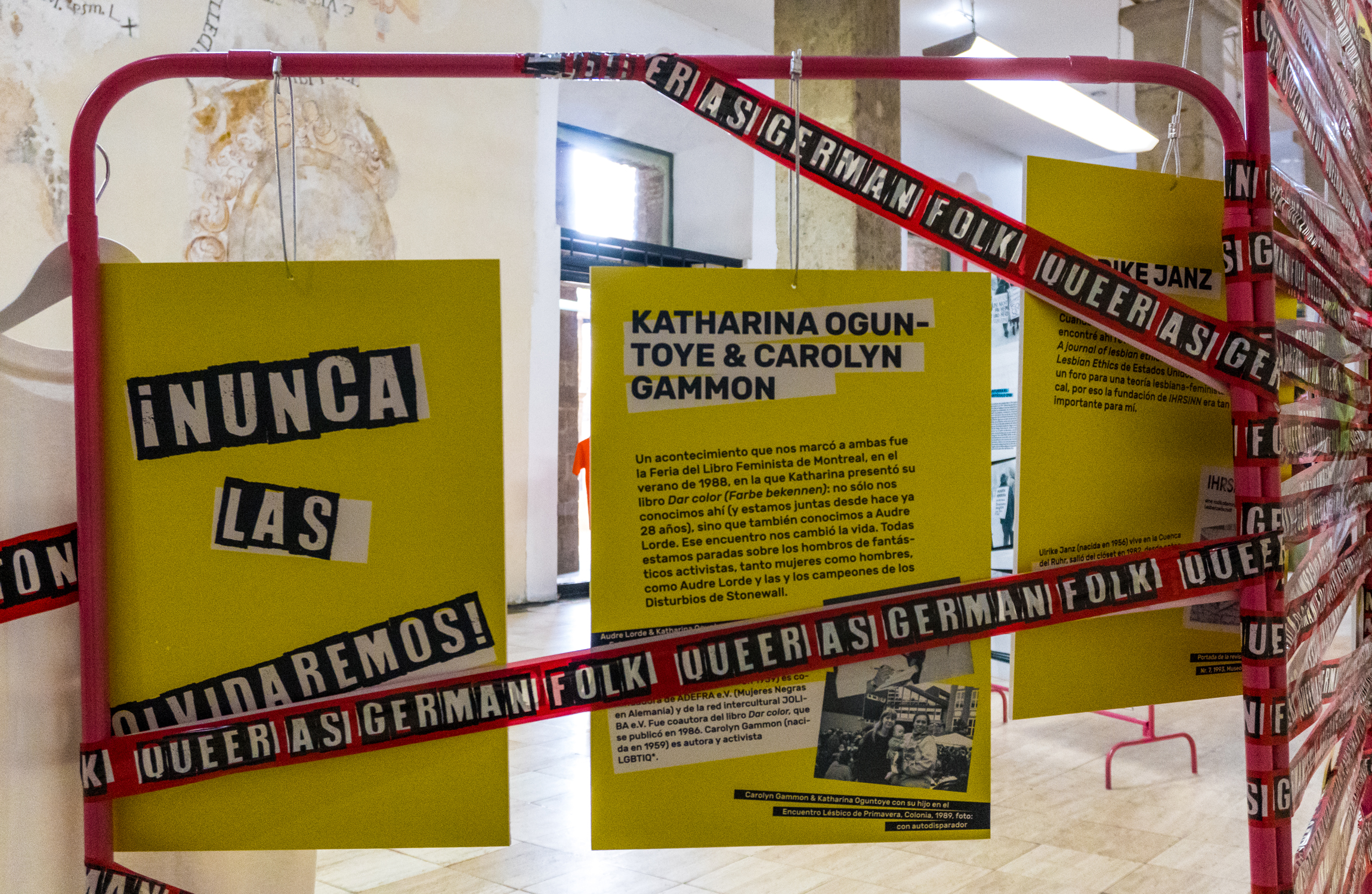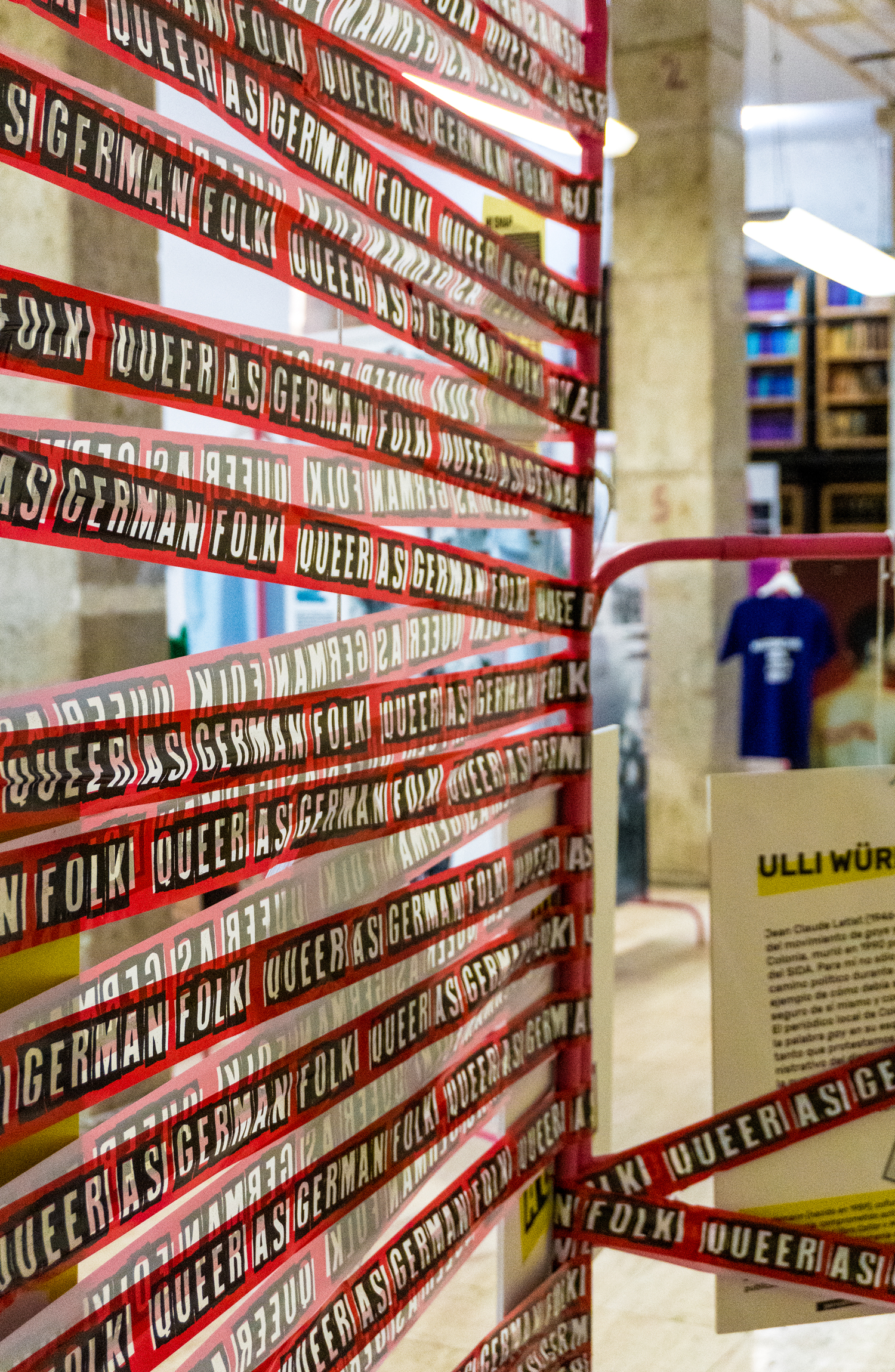 In heteronormativen Gesellschaften bedarf es immer bewusster Entscheidungen und Aktionen, um non-konforme Geschlechtsidentitäten zu leben: das coming out of the closet. So erinnert die Ausstellung Queer as German Folk nicht von ungefähr an einen bunten begehbaren Kleiderschrank. Gewidmet ist die Schau dem queeren Kampf und stellt Bezüge zwischen den Stonewall Riots im Juli 1969 und der deutschen queeren Bewegung her. Knapp 100 Exponate sind auf verschiedenen Materialien wie T-Shirts, Leinwänden, Plakaten und Flyern an zahlreichen grellpinken Kleiderstangen angebracht, die die Besucher*innen eigenhändig erkunden können. Der weitläufige, lichtdurchflutete Saal des Centro Cultural México Contemporáneo verwandelt sich damit in einen politischen Raum, in dem der Antagononismus öffentlich/privat aufgebrochen werden kann: Ebenso wie der Kampf der LGBTIQ*‑Community stets auf privater wie auf gesellschaftlicher Ebene verlief (und immer noch verläuft), werden intime, subjektive Perspektiven mit allgemeinen historischen Informationen verwoben. Jede*r kann in der Ausstellung auch die eigene queere Geschichte hinterlassen und damit einen Beitrag zur Ausstellung leisten.