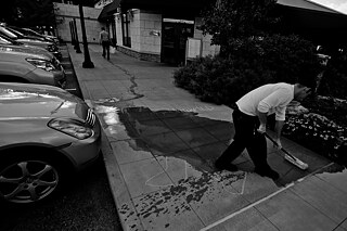 #ChalkedUnarmed. #ChalkedUnarmed (desarmado dibujado en gis). El dueño de una tienda lava un dibujo en gis en Frontenac Mal, en Frontenac, Misuri.
