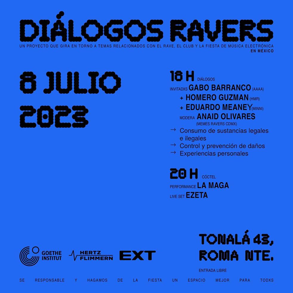 Al finalizar el conversatorio, nuestros amix de Diálogos Ravers ofrecerán un cocktail de cortesía junto con el Live Set de EZETA. Tendremos también sorpresas como entradas para la próxima EXT. y SIC Community Club y la 22. Semana de Cine Aleman.