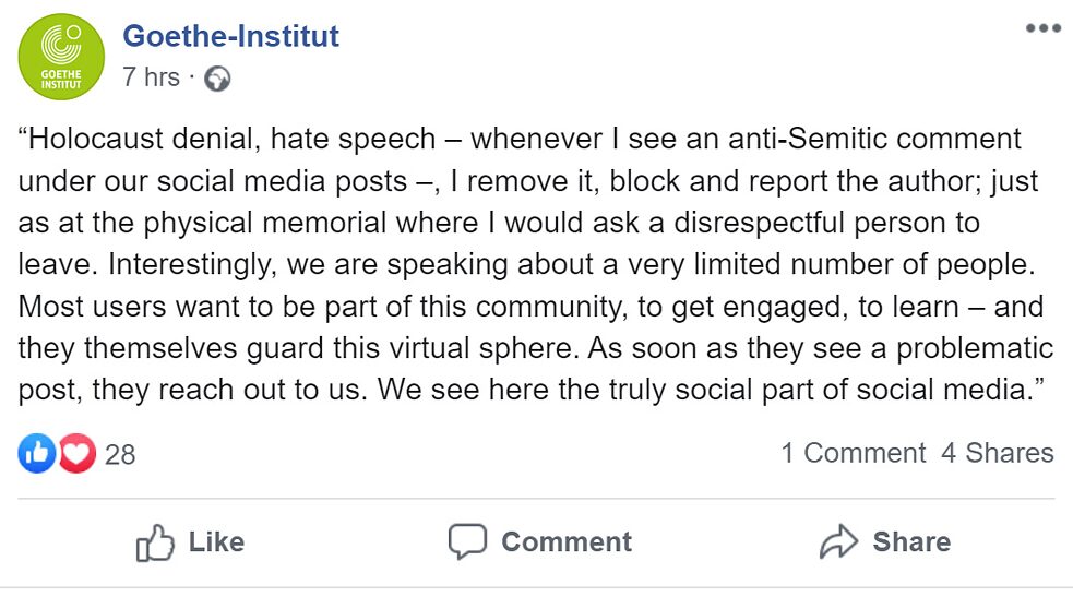 Ich kann jemanden blockieren und melden, aber ich kann eine Person nicht von Twitter oder Facebook entfernen. Die Plattformen schon. Das ist ein allgemeineres Thema. Die Sprache dieser Firmen hat sich über die Jahre hinweg verändert. Zu Anfang lehnten sie jegliche Verantwortung für das, was die Leute schreiben, ab. Sie haben sich nun dahingehend bewegt, dass sie die Tatsache anerkennen, dass ihre Netzwerke dazu benutzt werden können, andere zu manipulieren und Fake News zu verbreiten. Hinzu kommt, dass sich das europäische, insbesondere das deutsche Vorgehen gegenüber Holocaustleugner*innen stark vom amerikanischen unterscheidet – aufgrund des ersten Verfassungszusatzes und dem entsprechenden Verständnis der Redefreiheit. Und die Firmensitze von Social-Media-Unternehmen befinden zum Großteil in den USA.