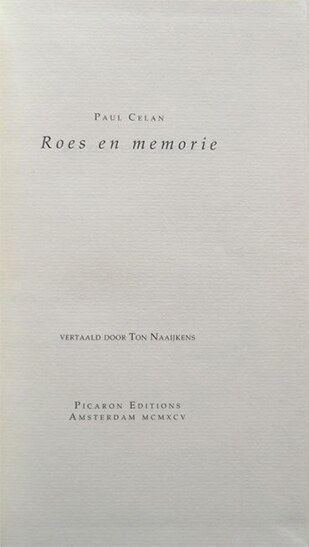 Roes en memorie Paul Celan Translation: Ton Naaijkens Amsterdam, Picaron Editions 1995 78 pages
