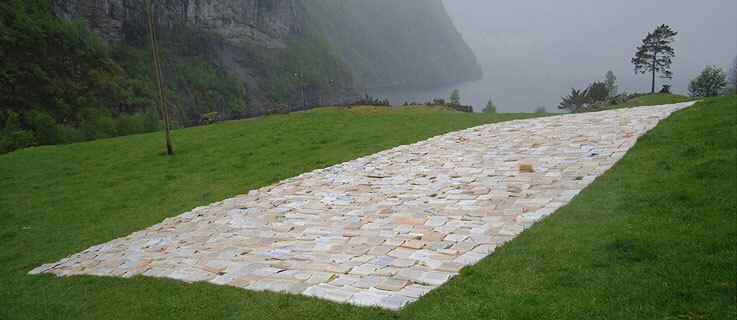 Installation auf der Insel Osterøy mit aussondierten Büchern der Bibliothek Osterøy. Kooperation von Vibeke Frost Andersen, Marie Skeie (NO), Jean-Baptiste Beovardi (FR) und KebreAb Demeke (ET). | Foto (Zuschnitt): Vibeke Frost Andersen