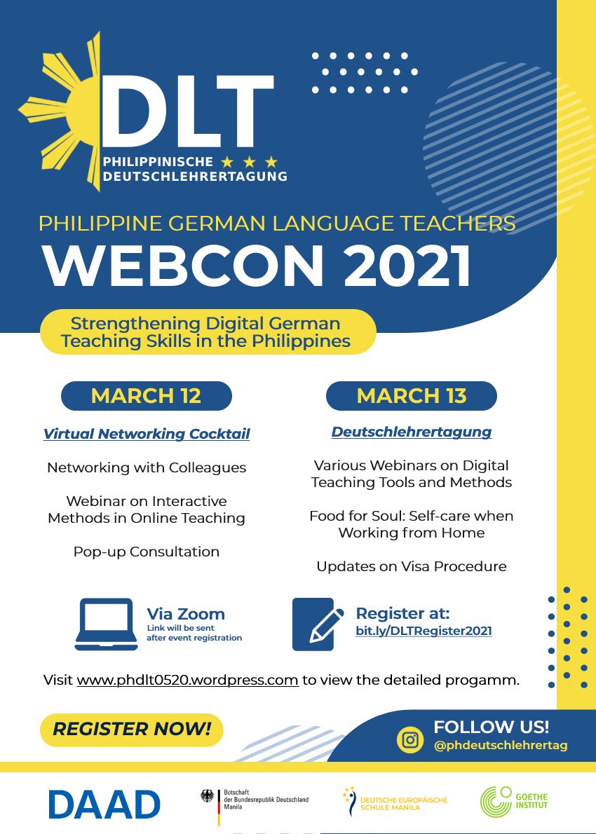 Ziel des DLT ist es, allen Deutschlehrern auf den Philippinen die Möglichkeit zu geben, sich über das neueste DaF-Material zu informieren, Lehrerfortbildungen zu besuchen, sich über Best Practices auszutauschen und ihr berufliches Netzwerk zu erweitern. Mit dem diesjährigen Thema "Stärkung des digitalen Deutschunterrichts auf den Philippinen" konzentriert sich die WebCon auf Chancen und Herausforderungen im digitalen Lehren, inspirierende digitale Werkzeuge und das Wohlbefinden der Lehrer*innen im Home Office.