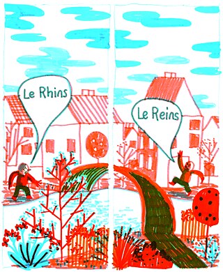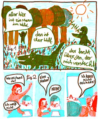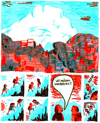 In „Saint-Victor-sur-Rhins“ nimmt uns Gregor Hinz mit in die gleichnamige kleine Gemeinde in der französischen Auvergne-Rhone-Alpenregion. 2014 hat er in Frankreich zwei Monate lang Kinder an verschiedenen Schulen beim Comiczeichnen unterstützt. Seine Bildergeschichte setzt sich aus einer Reihe von mit Filzstift gemalten Fragmenten zusammen, die augenzwinkernd von seinen Reiseeindrücken erzählen.