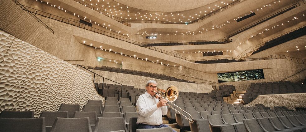 „Ja, ich war angenehm überrascht“, sagt der Konzertmeister. Als ich ihn frage, was ihm noch gefallen hat, antwortet er mir: „Die Leichtigkeit, mit der man in der Elbphilharmonie spielt. Auf der Bühne ist jeder Ton klar und deutlich zu hören, der Prozess der Tonerzeugung ist also außerordentlich einfach. Es gibt keine dunklen Bereiche im Saal, und sicherlich nehmen die Besucher auch die Musik auf diese Weise wahr: als klar, durchsichtig, präzise und subtil. Auch wenn ich zugeben muss, dass der Saal einen gewissen Nachhall hat, der manchmal hilfreich sein kann, aber nicht immer. Nun ja, die Elbphilharmonie ist ein spektakuläres Gebäude, der große Konzertsaal ist wunderschön, und die Wände haben eine äußerst delikate, nahezu organische Struktur – die sogenannte „weiße Haut“. Ja, alles ist hier vom Feinsten, und doch muss ich zugeben, dass ich lieber in Konzertsälen spiele, die mit Holz verkleidet sind. Denn ein warmer Klang, insbesondere der Streichinstrumente, ist für mich das Allerwichtigste.“