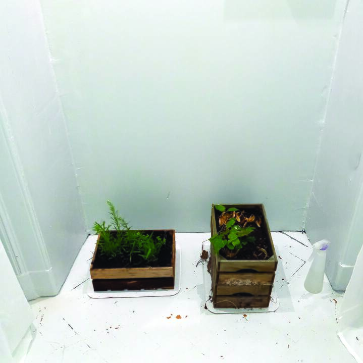 Am 12. Juli 2024 eröffneten wir in den Räumen des Stettiner Kultur-Inkubators die Ausstellung „Überwuchern + Botschaft der Natur“, die aus drei zusammenhängenden Expositionen bestand. Bei der ersten handelte es sich um eine Installation, in der der Rezipient den Botschaftern begegnet – Pflanzen, die spontan die Pflanzenkisten in Vorstadtgebieten bewachsen haben. Die Botschaftsräume waren durch ein Gerüst mit einem Vorhang abgetrennt und wurden Besuchern, die den Botschaftern in einem geschützten Raum begegnen wollten, zugänglich gemacht, nachdem sie sich mit dem diplomatischen Protokoll vertraut gemacht hatten. Über den Pflanzenkisten waren Schaukästen angebracht, die die Mitteilung der Botschafter präsentierten, indem sie Elemente von Forschungsarbeiten an Materialien zeigten, die beim Konstruieren der biologisch abbaubaren Öko-Botschaft (natürliche Klebstoffe, getrocknete Gräser und gepresste organische Materialien) verwendet wurden.