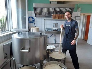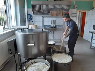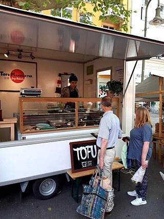 „Jeden Monat verarbeiten wir eine Tonne Sojabohnen, die wir von deutschen Bio-Sojabäuerinen und -bauern beziehen. Wir arbeiten in zwei Schichten. Wir benutzen keine großen Maschinen, sondern machen alles in Handarbeit. Den fertigen Tofu liefern wir mit Fahrradkurieren an zwölf Bioläden und zwei Restaurants aus. Jeden Samstag verkaufen wir unsere Produkte auch auf einem Wochenmarkt. Wir haben einen Marktwagen, an dem wir Tofu-Kebab anbieten“, erklärt Adrian.