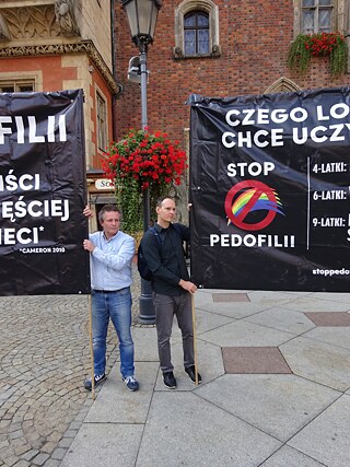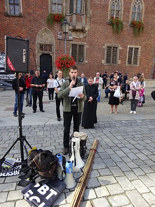 2. Sie starren uns an. Die Männer stehen vorm Rathaus. Ihre Demonstration darf in der Mitte der Stadt stattfinden, auf dem Rynek, dem Großen Ring, während die Rainbow-Bewegung sich am Ende eines kurzen Marsches zwischen einer Betonunterführung und dem Stadtgraben wiederfindet. Die Männer stehen vorm Rathaus. Martialisch. Sie starren uns an. Die Männer tragen ein Poster, auf dem sie sich gegen Pädophilie aussprechen. Doch darum geht es nicht, in Wahrheit. Sie insinuieren, dass Homosexuelle pädophile Neigungen haben. Sie wollen Sexualität, die nicht ihren Normen entspricht, denunzieren, herabwürdigen und, wie in etlichen Orten Polens gerade passiert, verbieten. Der junge Mann am Mikrofon, gleich in seinem Windschatten steht ein Priester, der ihm durch seine Anwesenheit sinnbildlich den Segen Gottes spendet, hetzt gegen alles, was nicht urkatholisch ist. Das Starren der Männer, die das Plakat tragen, reizt mich. Ich gehe auf sie zu, stehe einen halben Meter vor ihnen, ich nehme eine Kamera aus der Tasche und fotografiere seelenruhig das Starren. Ich lasse mir Zeit. Die Männer zischen, fletschen die Zähne, als würden sie mich auf der Stelle am liebsten beißen. Ich blicke ernst zurück und drücke auf den Auslöser.