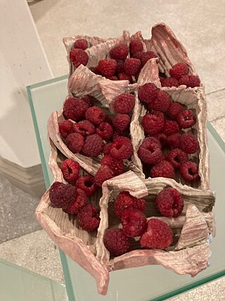 8. Als Probeläufe für ihre eindrucksvolle Keramikskulptur hat Katarzyna Koczyńska-Kielan zwei Tabletts entworfen, auf denen sie ursprünglich Himbeeren während des gemeinsamen Essens servieren wollte. Obwohl bis gestern überall Himbeeren im Angebot gewesen seien, seien plötzlich keine mehr aufzutreiben gewesen, sagt sie, während wir am Mittag in ihren Universitätsräumen filmen, überall habe sie gesucht, in Supermärkten, auf dem Markt, keine Chance.