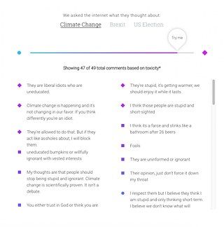 Die Schnittstelle dient dazu, den Algorithmus unterschiedlichen Forschern für die Entwicklung ihrer Tools gegen Hasskommentare zur Verfügung zu stellen. Das erste Projekt aus dieser Reihe bildete Anfang 2017 ein Schieberegler, der Kommentare zu verschiedenen Diskussionen auf einer Skala von 1 (sehr konstruktiv) bis 100 (Hate Speech) einordnet. Das Tool hat dabei verschiedene Aussagen zu den Themen Klimawandel, Brexit und der US-Wahl analysiert. Es versucht die Sätze ganzheitlich und somit nicht lediglich nach Stichwörtern auf ihren „toxischen Gehalt“ zu untersuchen.