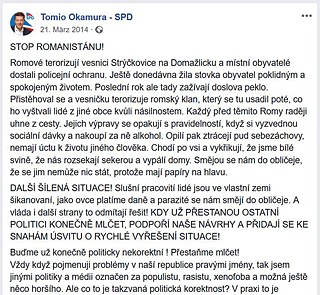 „Das größte ‚multikulturelle‘ Problem in der Tschechischen Republik sind ganz offensichtlich die Roma. Es mögen mir diejenigen verzeihen, die das nicht betrifft, aber ein großer Teil ist einfach eine riesige Belastung für die Gesellschaft“, schrieb er im März 2014 auf seinem Facebook-Profil.