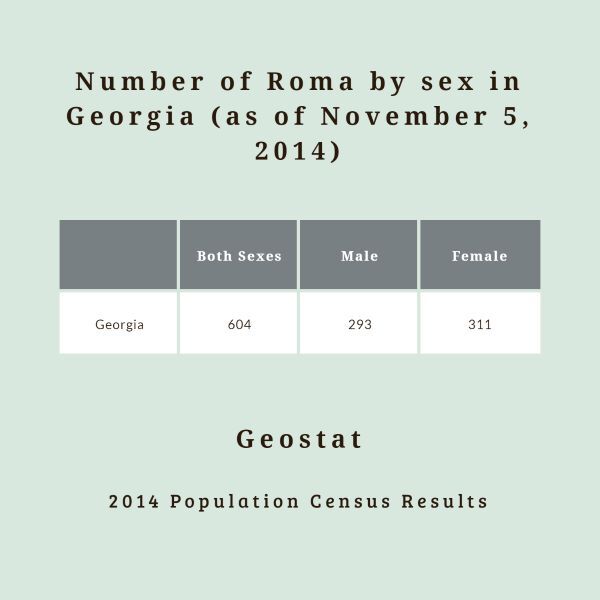 Im Vergleich zu anderen europäischen Ländern ist der Prozentsatz der Roma-Siedlungen in Georgien viel kleiner. Dennoch sind sie in den städtischen Siedlungen in großer Zahl vertreten. Offiziellen Geostat-Daten zufolge beläuft sich die Zahl der Roma in Georgien auf etwas mehr als 600, aber inoffiziellen Quellen zufolge liegt ihre Zahl bei über 2000. In einem Interview mit Radio Freies Europa sagte Elene Proshikiani, eine Sprecherin der Roma-Gemeinschaft, dass die Mitarbeiter von Geostat in vielen Fällen keinen Fuß in Häuser setzten, in denen Roma lebten. "Der Grund dafür war entweder, dass sie nicht zu Hause waren, oder der Faktor Angst eine Rolle spielte."