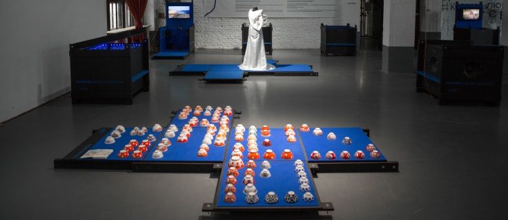 Die Installation „100 Pialas“ von Katya Isaeva erinnert ebenfalls an kulturelle Gemeinsamkeit. Zu Sowjetzeiten, die die heute längst in Moskau lebende Künstlerin als Kind im heimatlichen Karaganda erlebt hat, standen Pialas für den Alltag und die Traditionen der „östlichen“ Regionen des Landes. Sie wurden – wie Isaeva uns deutlich veranschaulicht – in Keramikfabriken überall in der UdSSR hergestellt (davon zeugen Markierungen auf den Böden); heute sind viele dieser Fabriken geschlossen. Pialas waren bekannt und vertraut für Menschen, die hunderte und tausende von Kilometern weit entfernt voneinander lebten. Viele der ausgestellten Pialas haben ihre eigene Geschichte und tragen Erinnerungen ihrer ehemaligen Besitzer. Einige davon wurden der Künstlerin in persönlichen Gesprächen und Briefen anvertraut und leben weiter als Teil ihres Werks.