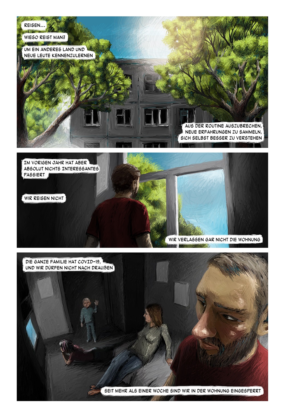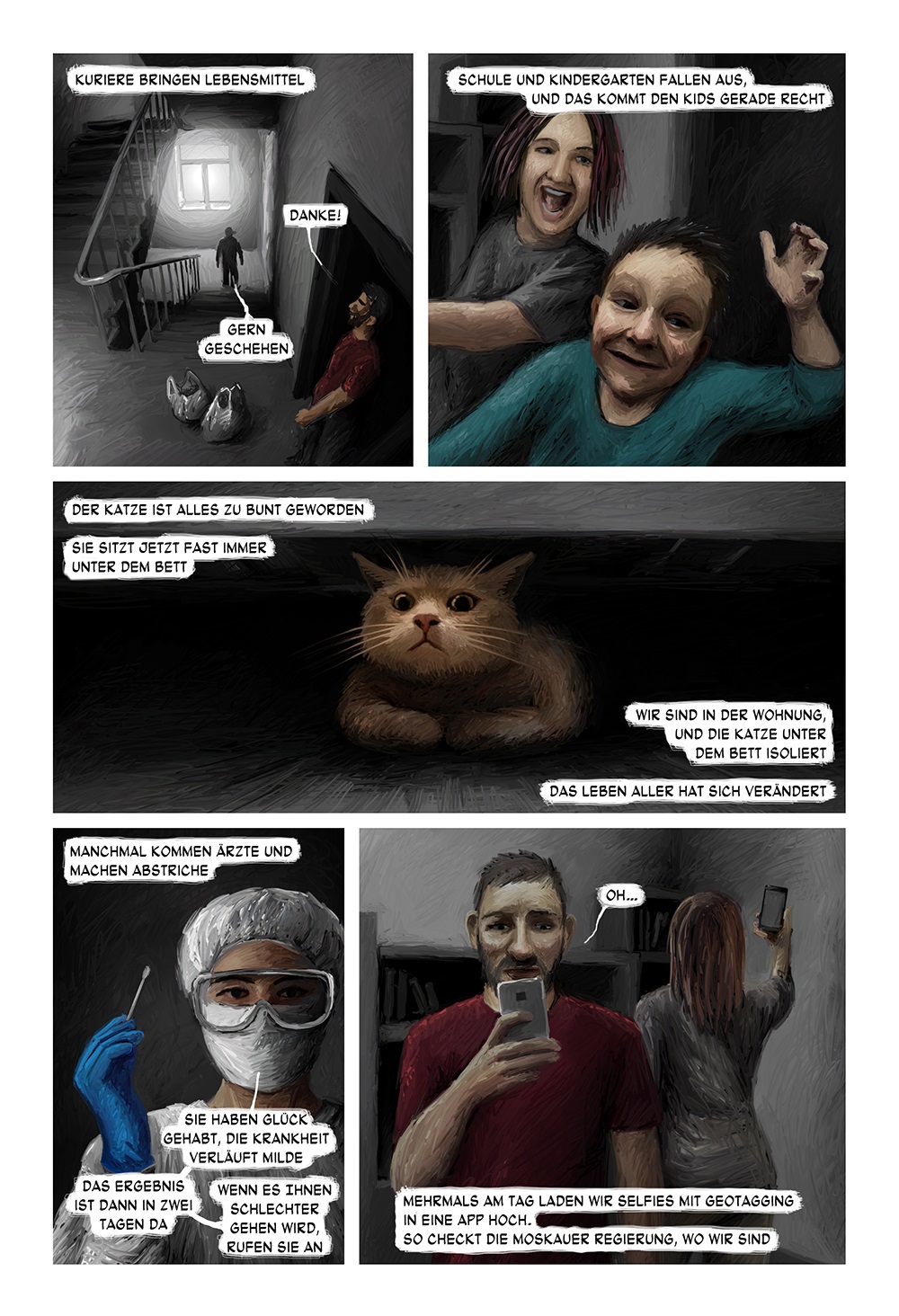 Der Künstler Nikolaj Pissarew erzählte in einem Comic über seine "Reise" in die Rote Zone: "Reisen... Wieso reist man? Um ein anderes Land und neue Leute kennenzulernen, aus der Routine auszubrechen, neue Erfahrungen zu sammeln, sich selbst besser zu verstehen. Im vorigen Jahr hat aber absolut nichts Interessantes passiert. Wir reisen nicht. Wir verlassen gar nicht die Wohnung. Die ganze Familie hat COVID-19, und wir dürfen nicht nach draußen. Schule und Kindergarten fallen aus, und das kommt den Kids gerade recht. Der Katze ist alles zu bunt geworden, sie sitzt jetzt fast immer unter dem Bett. Wir sind in der Wohnung, und die Katze unter dem Bett isoliert. Das Leben aller hat sich verändert."