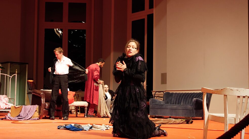 Die Handlung von „Blaubart“ spielt in einer großzügigen Wohnstube des 19. Jahrhunderts, deren Boden mit Herbstblättern bedeckt ist.