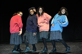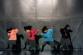 In Schlabberklamotten, mit ollen Pünktchen-Kleidern unter überlangen Trainingsjacken und dicken Brillen auf den Nasen, entern Nora Abdel-Maksoud, Suna Gürler, Rahel Jankowski und Cynthia Micas die leere Bühne, sehen ein bisschen aus wie Putzfrauen auf Abwegen, aber strahlen aus: „We don’t give a shit“, kümmert uns nicht die Bohne. Lässig grooven sie los. Die Köpfe wippen, Rap-Rhythmen treiben sie innerlich an, scheint’s. Sibylle Berg hatte sich in einer Regieanweisung „Gerne viel Musik“ gewünscht. Kriegt sie. Alles A capella, vom leise angesummten „Clint Eastwood“ der Gorillaz bis zu hart eingetanztem Dubstep. Aber auch der Sprechtext schwingt, bebt, hämmert, ist durch und durch musikalisiert. Ohne Ruhe, ohne Unterlass, aber mit rasanten Ton- und Taktwechseln stampfen und tänzeln die vier durch die Philippika. Nüblings Choreographin Tabea Martin hat ganze Arbeit geleistet.