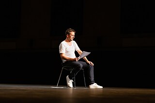 B. N.: Das ist — könnte man sagen — ein inszenatorischer Effekt, dass ich als Regisseur und Autor plötzlich selbst die Bühne betrete, mich auf einen Stuhl setze und einen Text vorlese, der zwischendurch fast schon ins Manifestartige geht. Dabei ist letztendlich total entscheidend, dass die Person, die das geschrieben hat, die das bezeugt, live auf der Bühne ist. Und gleichzeitig gefällt mir diese extreme Reduktion von Theater. Es ist ein Theaterstück, aber die Schauspieler*innen sind nicht da, die Mittel sind sehr reduziert und letztlich ist es der Regisseur und Autor, der es einfach selbst macht. Das ist für dieses Thema total wichtig: dass Schritt, das Wagnis durch mich, den Regisseur, den Autor selbst begangen oder performt wird. Und nicht durch einen Schauspieler oder eine Schauspielerin, die das für mich tut.