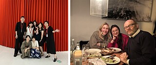 2022年夏,上海,UCCA Edge工作期间,经历“上海之春”后,与团队在Thomas Demand个展开幕现场(左)。2025年春,在柏林与Demand及工作室友人告别(右)。 | © Ara Yun Qiu
