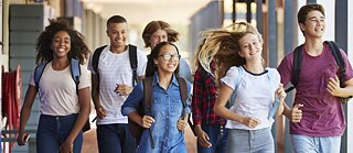 Grundschulkinder mit Schulranzen auf dem Rücken laufen nach Schulschluss heiter nach davon.
