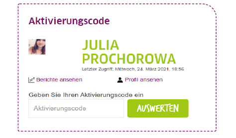 Um ein Eltern- oder Lehrer-Konto mit einem Kinder-Konto zu verknüpfen, um die Fortschritte des Kindes/Schülers zu beobachten, wird für jedes Konto ein Aktivierungscode bereitgestellt. Diesen Aktivierungscode finden Sie unten im Profil: