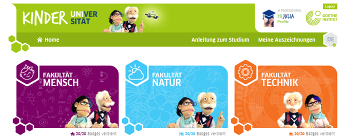 ("Home") Button, "Anleitung zum Studium", ein Lernhandbuch in dem die Funktionsweise der Kinderuni kurz beschrieben wird) und "Meine Auszeichnungen", in der alle gesammelten Badges aufbewahrt werden:
