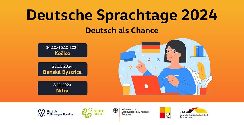Erleben Sie drei Tage lang Deutsch an drei verschiedenen Orten – in Košice, Banská Bystrica und Nitra – und entdecken Sie mit uns die Möglichkeiten und Chancen, die Deutsch als Sprache mit sich bringt.