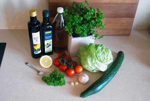 • Fatoush, arabischer Salat:  Zutaten für 4 Personen: 3 Tomaten, 1 Gurke, 1 Eisbergsalat, 2 Knoblauchzehen, 2-3 Blätter Minze (oder Gewürz mit Minze), ein paar Stängel Petersilie, 4 EL Essig, 3 EL Olivenöl, Saft von einer ½ Zitrone, ½ TL Salz, Fladenbrot Foto: © Andrea Gehwolf