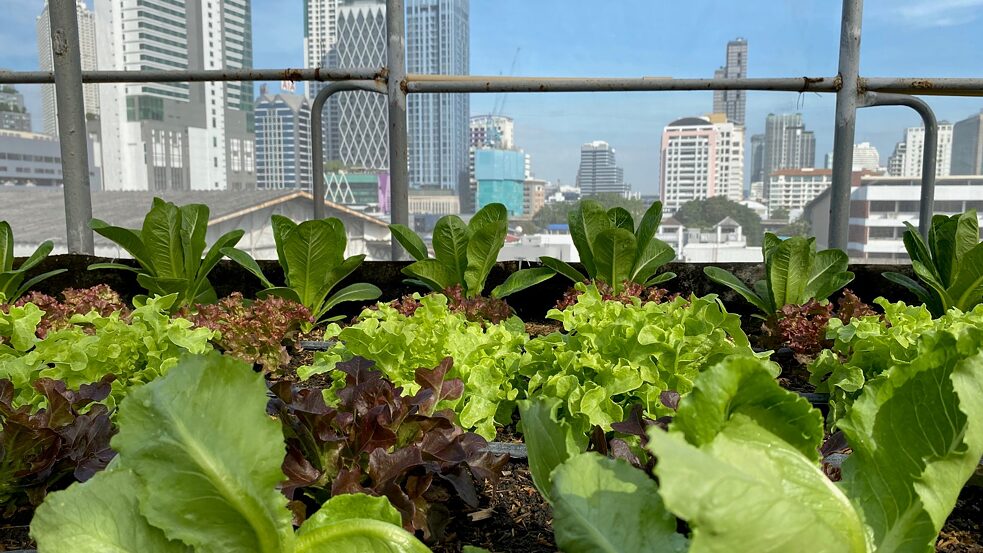 Hohe Preise und die begrenzte Verfügbarkeit von Biogemüse in Indonesien waren Grund genug für Winartania, um ihren eigenen biologischen Gemüsegarten anzulegen, wenn auch ihre ersten Versuche nicht sehr erfolgsversprechend waren. Nachdem sie sich eine Weile auf eigene Faust damit herumschlug, schloss sie sich mit anderen Gärtner*innen zusammen, um zu lernen und ihr Wissen über Gemüseanbau, Bodendüngung, die Bedeutung von Erde und Sonnenlicht, richtiges Samenziehen und über das Wachstum und die Entwicklung verschiedener Gemüsesorten zu vertiefen. Aus dem privaten Interesse entstand dann „Indonesia Berkebun“, ein Urban-Farming-Netzwerk, das Menschen und Gemeinschaften verbindet und sie dabei unterstützt, verlassene Grundstücke in urbane Grünräume zu verwandeln, um Indonesier*innen mit Bio-Gemüse versorgen.Veerawan Katanyuvivad verriet uns die Entstehungsgeschichte ihres Dachgartens. Ursprünglich baute ihre nunmehr verstorbene Tante im 4. Stock des Gebäudes Gemüse an. Sie zeigte den Sicherheitskräften des Gebäudes, wie man Gemüse anbaute und daraufhin bat Veerawan ihren Vater, ein Ingenieur mit Expertise auf dem Gebiet Bewässerungssysteme, ihren Garten auf das Gebäudedach zu verlegen und zu vergrößern. Was – genauso wie bei Winartania – ursprünglich als Küchengarten für ihre Familie gedacht war, sprach sich schnell herum und die Nachbar*innen begannen zu fragen, ob sie einen Teil der Ernte auch kaufen könnten.
