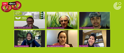 Die Veranstaltung wurde von den Bibliotheken der Goethe-Institute in Bangkok, Jakarta, Bandung und Yangon organisiert, die gemeinsam eine beeindruckende Bandbreite an Referent*innen versammelten. Darunter waren Tim Schumann und Jens A. Geissler, zwei deutsche Bibliotheksleiter, die wesentlich dazu beigetragen haben, die Rolle von Bibliotheken zu erweitern, nämlich von Orten, an denen gelesen wird und Bücher geliehen werden, hin zu Zentren des Umweltbewusstseins. Aus Indonesien waren der Architekt Sigit Kusumawijaya und Winartania dabei, die beide erfolgreich Menschen vernetzt und diese Netzwerke zu gemeinnützigen Umweltorganisationen aufgebaut haben. Die Bauunternehmerin Veerawan Katanyuvivad nahm aus Bangkok teil, wo sie viele Hürden überwinden musste, um Gemüse mitten in Sathorn auf Dachterrassen anzubauen. Moderiert wurde das Gespräch von Pattarasuda Anuman Rajadhon, eine von Thailands führenden Bühnenkünstler*innen und überzeugte Naturliebhaberin, die ebenfalls aus Bangkok zugeschaltet war.