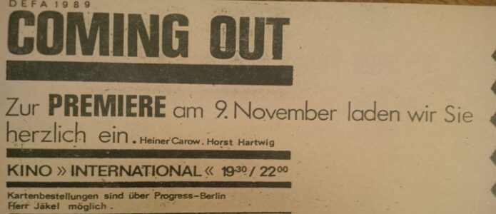The premiere was scheduled for 9 November. The film was called "Coming Out". It was about the self-discovery of a homosexual teacher in the GDR. Heiner Carow’s film was set to premier in the film theatre "International", which had hosted the premieres of the DEFA film studios, at half past seven in the evening. However, a few streets away and only one hour earlier, Günter Schabowski had announced the GDR’s political “Coming Out”, reading off his legendary sheet of paper. The explosiveness of Carow‘s "Coming Out" had been considerable up to this hour, and so it still seemed to those involved: it was the GDR’s first gay film. After seven years of being banned from his profession, Carow, who was a dissident of the SED and the director of the film adaptation of Plenzdorf’s "Die Legende von Paul und Paula", was allowed to make another feature film. It was a DEFA project eagerly awaited in the East. Carow had visited us several times for research talks in West Berlin.