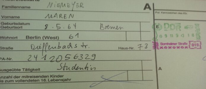 Invited by DEFA director Heiner Carow, she attended the premiere of the feature film “Coming Out” at cinema “Kino International” with her boyfriend. Since the premiere party happened to take place in proximity to the border crossing Bornholmer Straße, Maren Niemeyer had the historic fortune to be present when the wall came down and the border was opened for the first time for everyone from East Berlin.