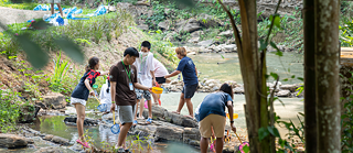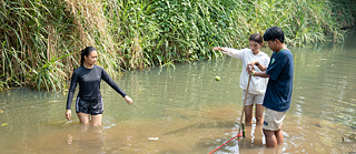 With the Support from the Thai Ministry of Education in cooperation with local experts, the German camp participants not only had the opportunity to improve their German knowledge, but also to expand and deepen their knowledge of water usage in Thailand, discussing their own actions in this context. Acknowledging the role of water in agri- and aquaculture, we harvested and processed rice, built a dike to stabilize the river beds, started our own population count of fish and other animals and analyzed water qualities.