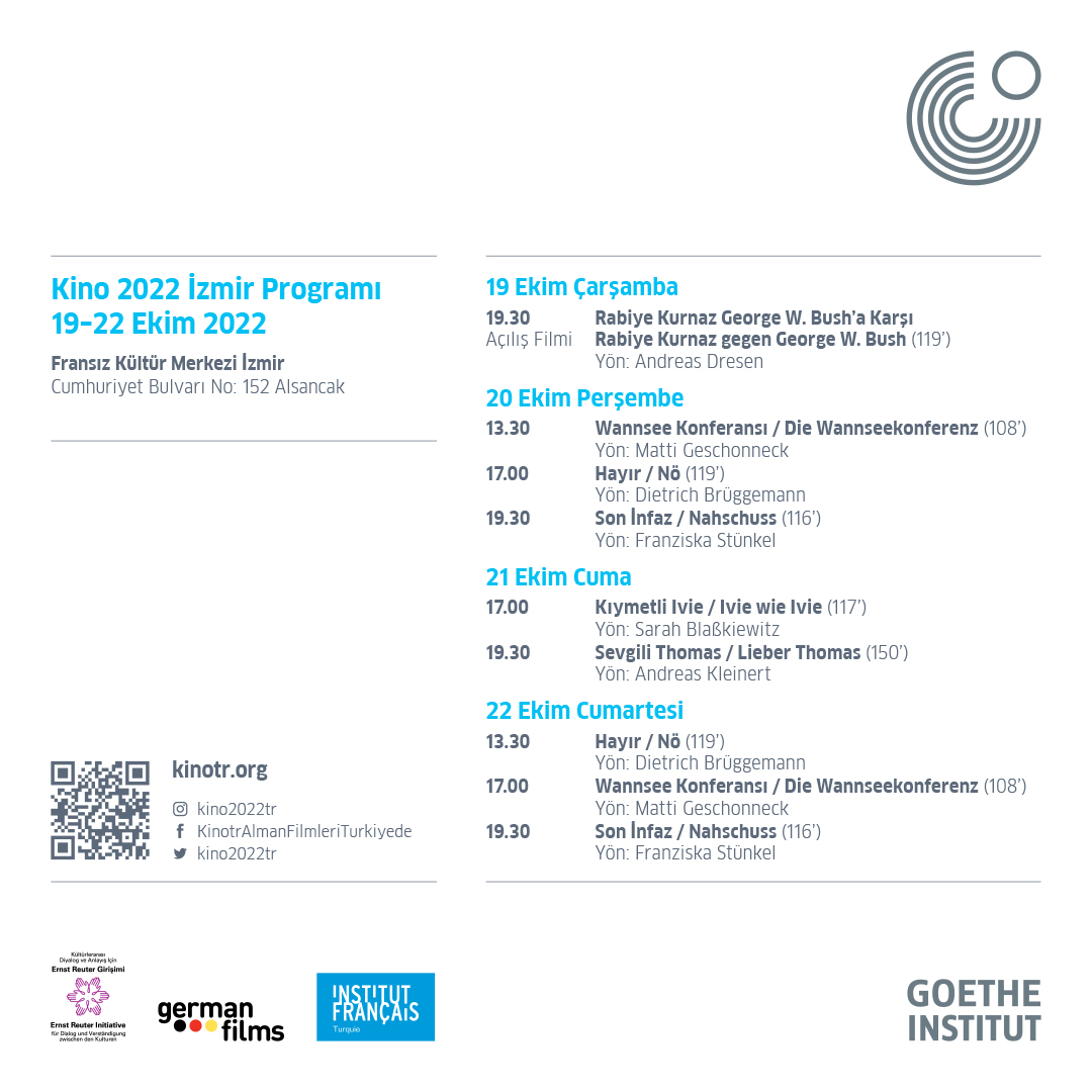 Das Izmir-Programm von Kino 2022 präsentiert dem Publikum in der Türkei die aktuellsten und erfolgreichsten Beispiele des deutschen Kinos und besteht aus einer Auswahl von 6 Filmen. Kino 2022 beginnt mit Andreas Dresens preisgekröntem Film “Rabia Kurnaz gegen Geaorge W. Bush”, im Rahmen des Programms ist auch “Lieber Thomas” zu sehen, der in diesem Jahr beim Deutschen Filmpreis neun Kategorien, darunter den Besten Film, gewann. "Nahschuss" unter der Regie von Franziska Stünkel und mit Lars Eidinger in der Hauptrolle, die romantische Komödie "Nö" unter der Regie von Dietrich Brüggemann, "Die Wannseekonferenz" von Matti Geschonneck und "Ivie wie Ivie", ein preisgekrönter Debütfilm von Sarah Blaßkiewitz, sind die weiteren Filme des Kino 2022 Programms.