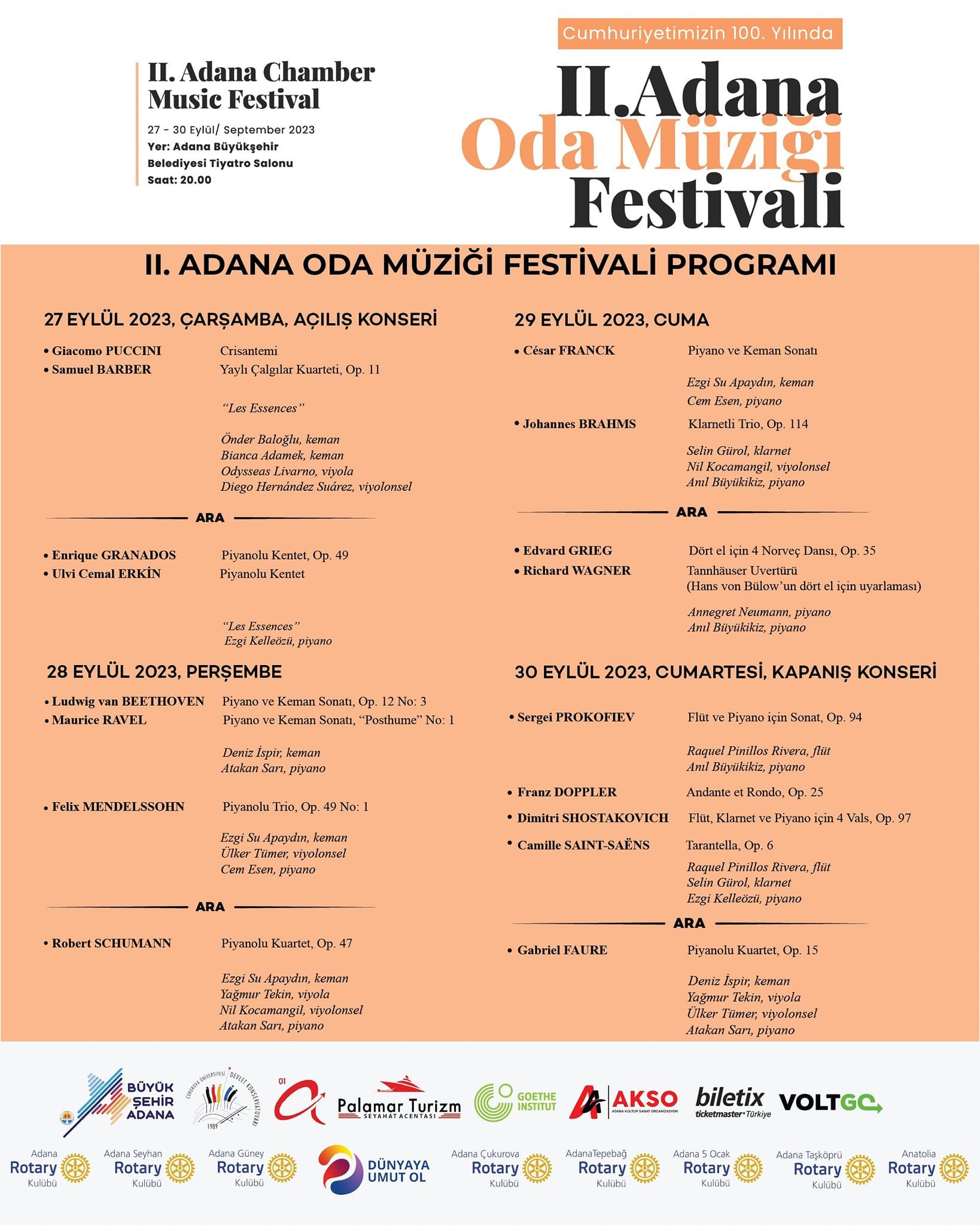 Das zweite Adana Kammermusik-Festival, das im letzten Jahr großes Interesse erregte, wird dieses Jahr vom 27. bis 30. September 2023 ausgerichtet.